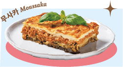 가지, 감자, 고기 등을 층층이 쌓아 만든 요리다. 재료들이 모두 준비되면 마지막에 베샤멜 소스를 부어 오븐에서 구우면 완성된다. 풍부하고도 진한 맛이 특징이다.
